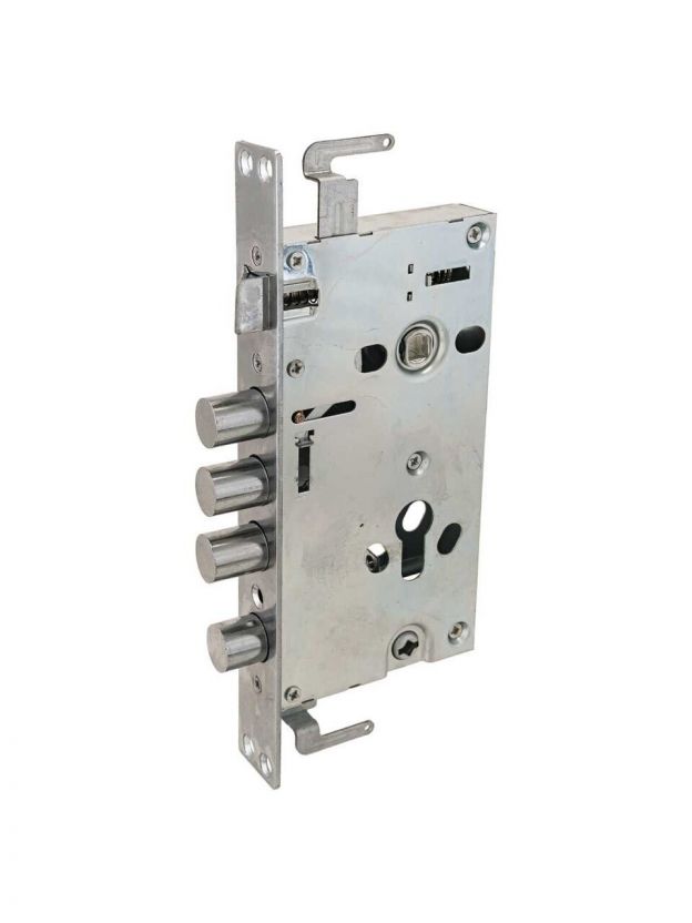 Замок врезной цилиндровый с защелкой и задвижкой, без механизма секрета. Предназначен для установки в китайские металлические двери в качестве основного замка. Реверсивная защелка позволяет устанавливать замок на правые и левые двери. Характеристики: Количество цилиндрических стальных ригелей: 3; Точек запирания: 3; Корпус замка: сталь, толщиной 0,9 мм; Удаление ключевого отверстия: 60 мм; Межосевое расстояние: 68 мм; Расстояние от центра механизма секрета до задвижки: 53 мм; Ширина корпуса: 88,5 мм; Цвет торцевой планки: хром; Ширина торцевой планки: 30 мм.