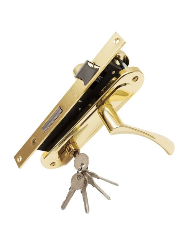 Замок врезной Trodos, 70-L/76 PB, 202097, ручка в комплекте, цилиндровый, золотой