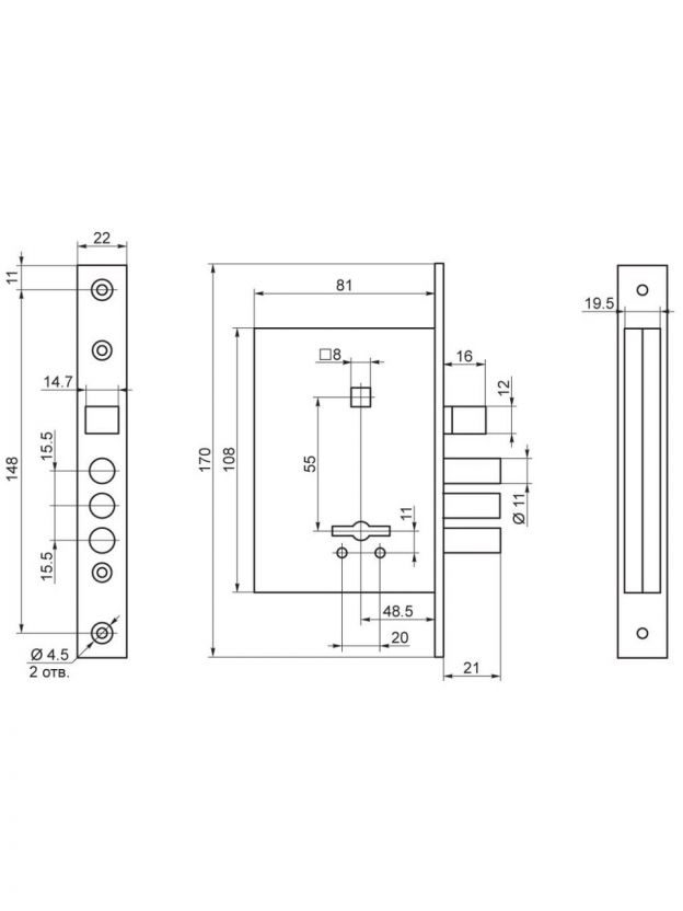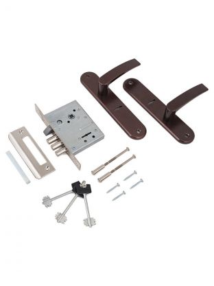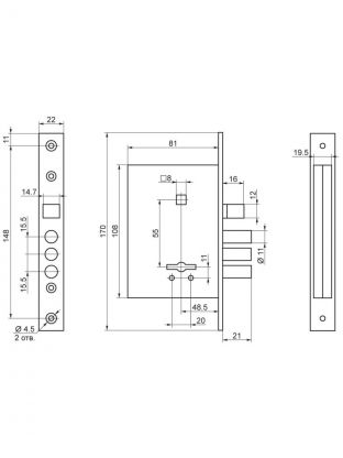 Замок врезной предназначен для установки в деревянные двери с толщиной полотна 40-50 мм. Он обеспечивает надежную защиту вашего дома или офиса благодаря своей прочной конструкции и качественным материалам. Комплектация: Замок. Ручки. 3 ключа. Ответная планка. Комплект крепежа. Характеристики: Межосевое расстояние: 55 мм. Удаление ключевого отверстия: 48,5 мм. Материал: алюминиевый сплав, сталь. Ресурс работы узла защелки более 250 000 циклов. Количество ригелей: 3. Преимущества: Классическая универсальная защелка обеспечивает надежное запирание двери без необходимости использования ключа. Это удобно, когда нужно быстро закрыть дверь, но нет времени искать ключ. Ригель обеспечивает надежную фиксацию двери в закрытом положении. Это повышает безопасность помещения и предотвращает возможность взлома. Совпадение по установочным размерам с китайскими замками позволяет использовать уже имеющиеся отверстия в дверном полотне. Межосевое расстояние замка является стандартным для большинства дверей, что делает этот замок универсальным и подходящим для широкого спектра дверей. Покрытие замка позволяет защитить его от воздействия влаги, кислот и других агрессивных веществ, предотвращая появление ржавчины и коррозии. Кроме того, оно увеличивает износостойкость поверхности, что особенно важно для деталей, подвергающихся интенсивному механическому воздействию. Это приводит к улучшению эксплуатационных характеристик изделия, увеличению срока его службы и повышению эстетической привлекательности.