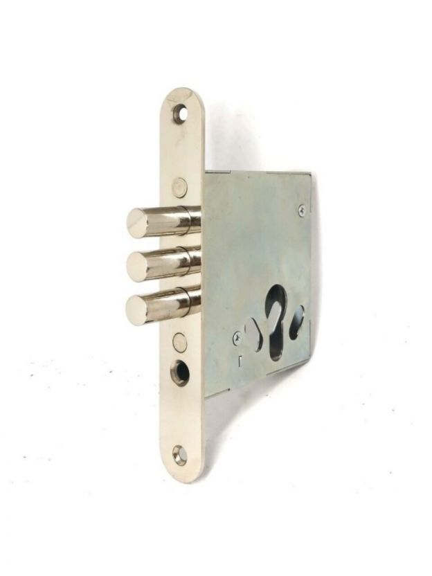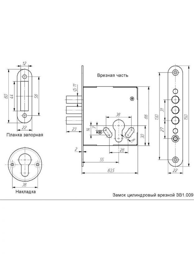 Замок врезной цилиндровый. Предназначен для входных и внутренних дверей толщиной 40-50 мм жилых домов, квартир, торговых помещений. Универсальный. Возможна установка как в правые, так и в левые двери. Засов из трех стальных стержней круглого сечения. Покрытие корпуса — цинковое. Покрытие лицевой и ответной планок — цинковое. Комплект круглых накладок, покрытие «цинк»