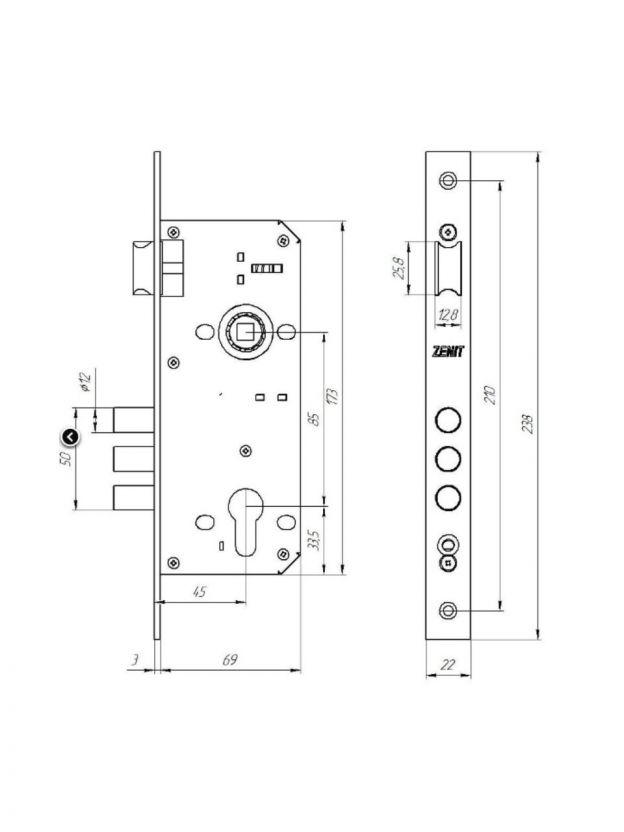 Замок врезной Зенит ЗВ4-85 цилиндрового типа предназначен для запирания левосторонних и правосторонних дверных полотен, открывающихся как внутрь, так и наружу. По посадочным размерам совпадает с замками Апекс 22 серии, Аллюр, Фуаро и другими замками китайского производства с межосевым расстоянием 85 мм. Замок рекомендуется устанавливать на наружные деревянные двери квартир и общественных зданий, толщина которых 40-45 мм, также возможен монтаж на металлические двери. Количество кодовых комбинаций цилиндрого механизма МЦ1-6 составляет 15.000 вариантов ключа. Замок врезной Зенит ЗВ4-85 цилиндрового типа сертифицирован по ГОСТ 5089 - замку присвоен 2 класс. Защелка дверного замка универсальная - смена стороны открывания происходит при вскрытии корпуса. Замок комплектуется фалевыми ручками с накладками типа РФ1-1-85. Дверные ручки крепятся между собой стяжными винтами.