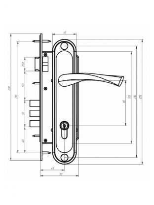 Материальное исполнение: Корпус, засов - сталь, Защелка - сплав цинковый, Ручки - сплав алюминиевый, Накладки - сталь
