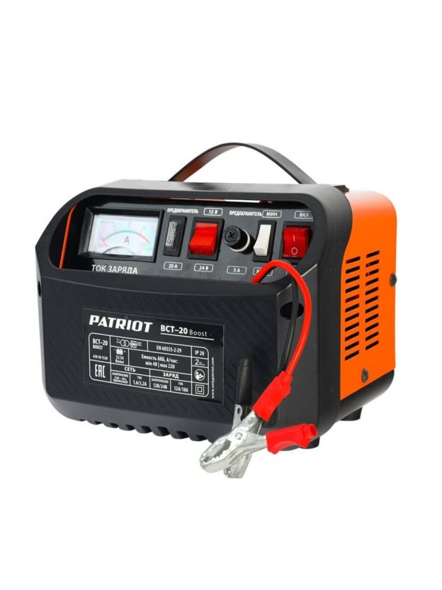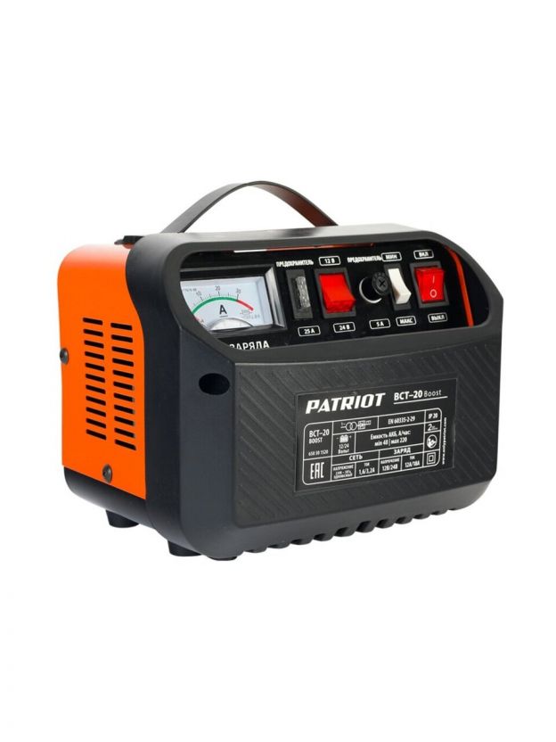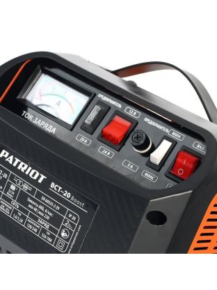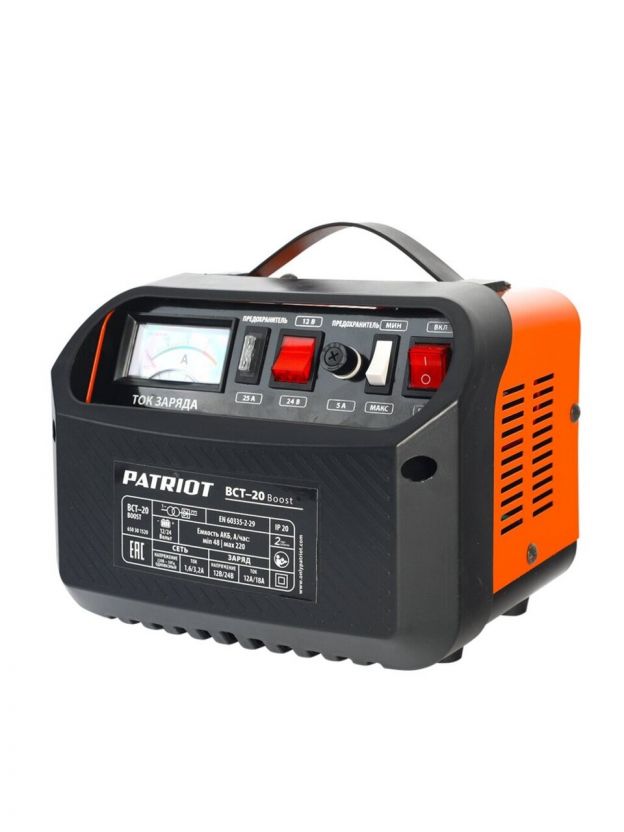 Зарядно-предпусковое устройство Patriot BCT-20 Boost применяется в сервисах или непосредственно владельцем автомобиля. Устройство для бытового полупрофессионального или профессионального использования. Предназначено для зарядки свинцовых, кислотных аккумуляторов напряжением 12В и 24В. Ускоренный режим зарядки с повышенным током. Устройство высокого качества, удобно в использовании, оснащено переключателем напряжения тока, амперметром, защитой от перегрузки, неправильной полярности, короткого замыкания. Отсек для хранения проводов. Характеристики: Макс. емкость аккумулятора: 220 А*ч. Напряжение: 220 В. Макс. ток зарядки: 18 А. Для аккумуляторов напряжением: 12/24 В. Макс. потребляемая мощность зарядки: 700 Вт. Мин. емкость аккумулятора: 48 А*ч. Габариты упаковки: 25,5х24,5х29,5 cм. Комплектация: Зарядное устройство. Комплект запасных предохранителей. Инструкция по эксплуатации. Преимущества: Встроенная защита; Для зарядки свинцовых и кислотных аккумуляторов; Режим Boost; Длительный срок службы. Модель рассчитана на длительный и активный срок эксплуатации. В ее производстве используются оригинальные и высококачественные комплектующие. Производитель обеспечивает прибор отличными технико-эксплуатационными показателями. Небольшие габариты и вес позволяют держать аппарат в машине.