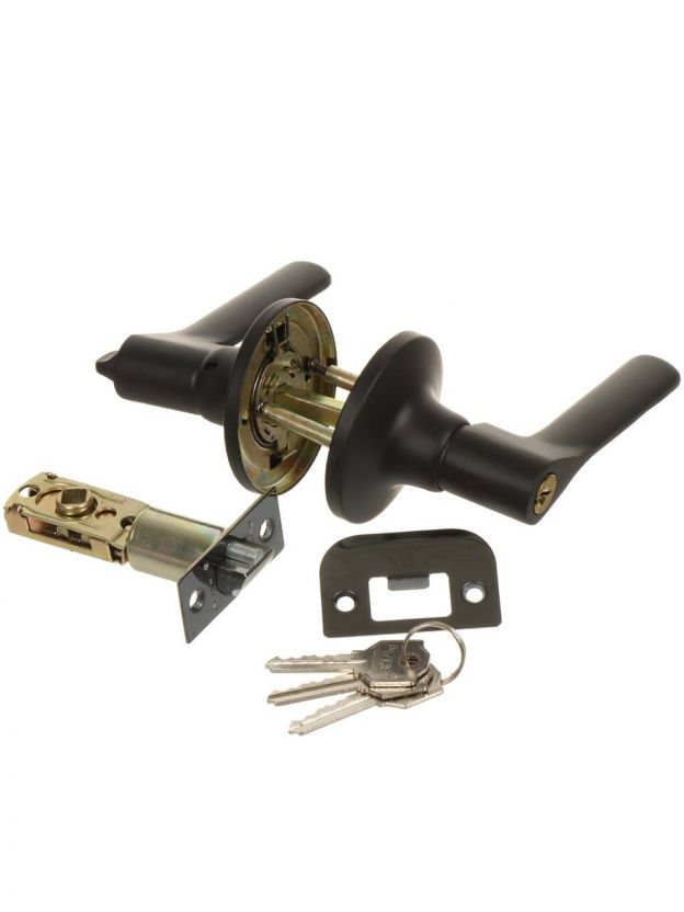 Защёлка предназначена для установки на легкие межкомнатные двери. Благодаря универсальной конструкции, не требуется переустановка механизмов для левых/правых дверей. Модель с фалевыми ручками, дополнительной фиксацией (ключ).
