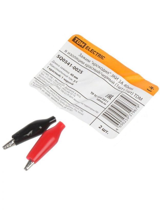 Зажим ЗКИ, крокодил, красный, черный, в изоляции, 3А, 1шт+1шт, 40 мм, TDM Electric, SQ0541-0025