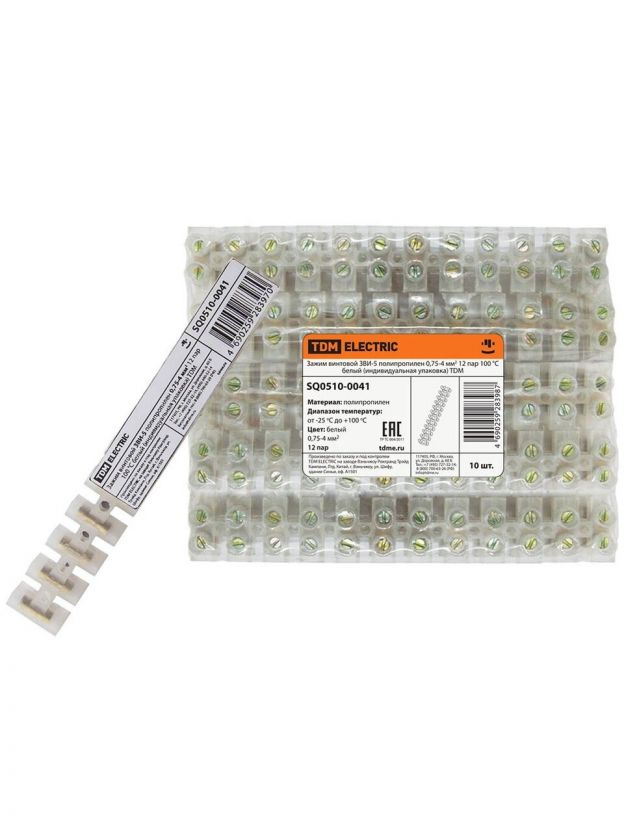 Зажим ЗВИ-5, винтовой, полипропилен, белый, 12 пар, 100°С, 0.75-4 мм2, TDM Electric, SQ0510-0041