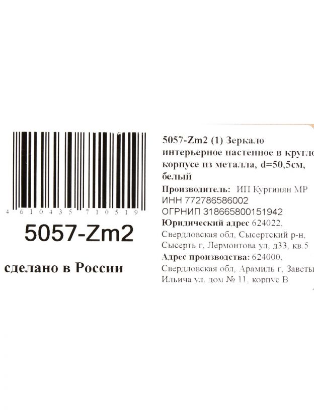 Диаметр зеркала — 50 см, рама выполнена из металла, основа — МДФ. Такое сочетание материалов гарантирует долговечность и эстетичный внешний вид.