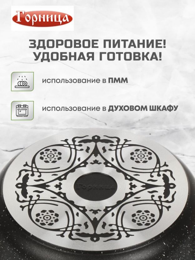 • Мраморное антипригарное покрытие — пища не пригорает, легко отмывается, безопасно для здоровья