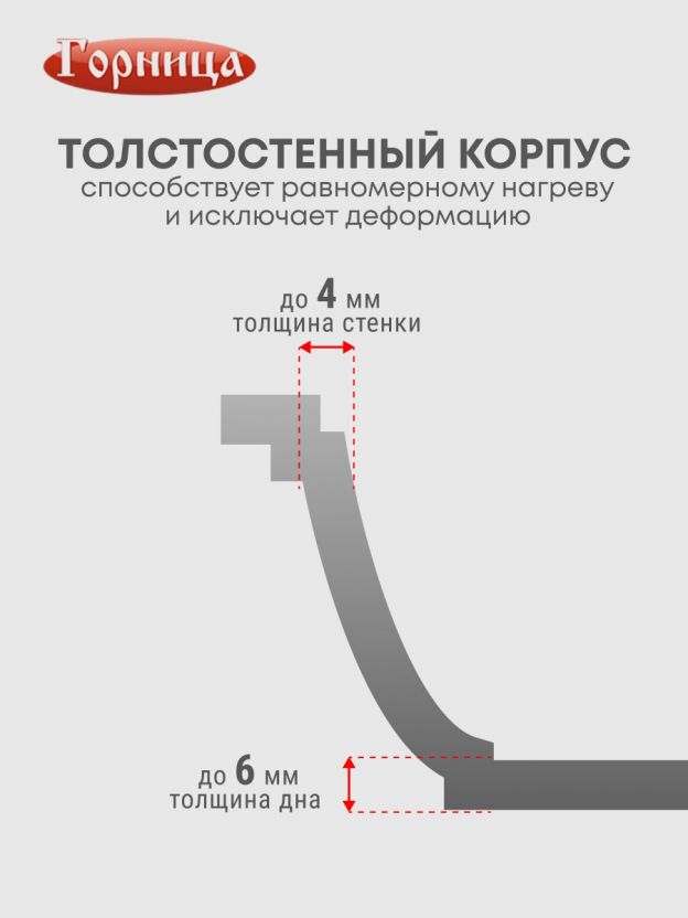 Одним из множества преимуществ литой алюминиевой посуды является экономия электроэнергии за счет необычайной теплоемкости алюминия. Утолщенное дно 5-6 мм и стенки 3,8-4,2 мм посуды ООО «Горница» при равномерном распределении тепла по всей поверхности посуды обеспечивают необходимый температурный режим, который позволяет приготовить вкусную и здоровую пищу, сохраняя при этом все полезные витамины и свойства продуктов.