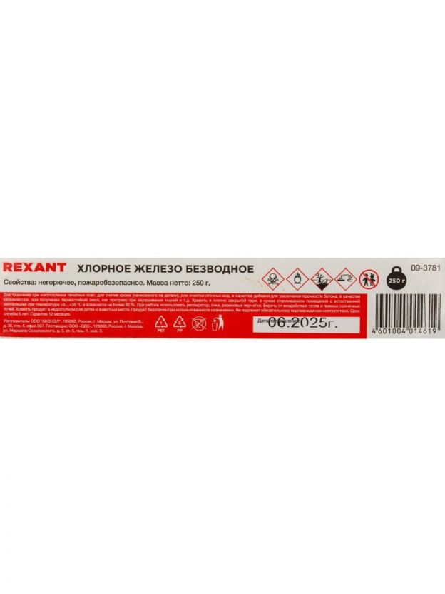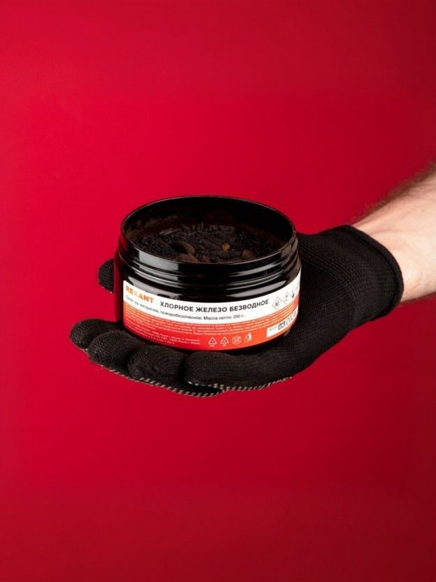 Железо хлорное безводное REXANT 09-3781 — эффективное средство для травления печатных плат, меди и ее сплавов в электронной промышленности и приборостроении. Удобная упаковка 250 г обеспечивает простоту хранения и использования. Продукт подходит для водного раствора, идеально вписывается в домашнюю мастерскую или дачный участок.