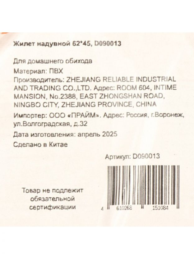 Жилет надувной 5-8 лет, 45х60 см, детский, оранжевый, D090013