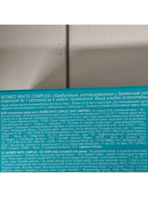 Комплексная натуральная зубная паста Biomed White Complex с тройной системой отбеливания зубов эффективно удаляет зубной налет, отбеливает эмаль, осветляя до 2 оттенков за 4 недели применения.