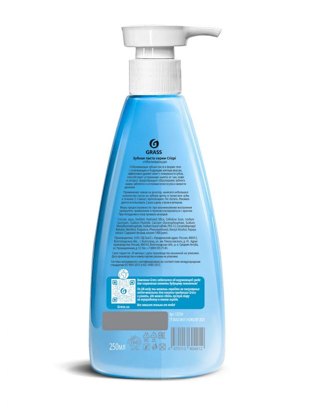 Зубная паста Grass, Crispi, 250 мл, Отбеливающая, с дозатором