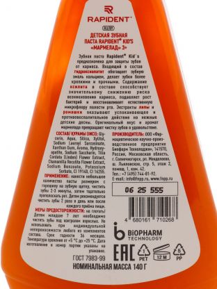 Зубная паста Rapident Kid’s Мармелад: бережный уход за детскими зубами, безопасный состав и вкус, который нравится детям. Объем 140 мл — экономия и забота о здоровье!