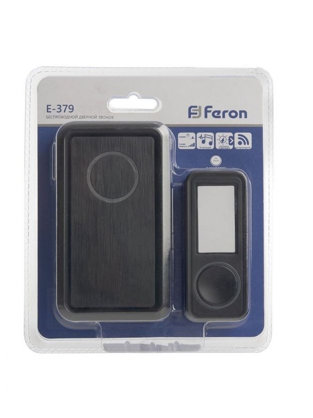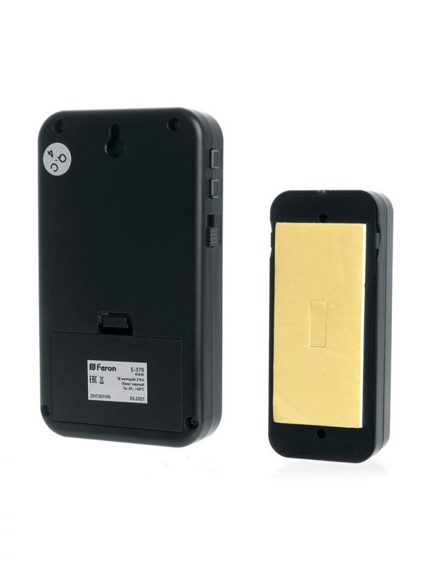 Звонок дверной беспроводной, на батарейках, 18 мелодий, кнопка IP 44, 2 х 1.5 В, АА, черный, Feron, Е379, 41436