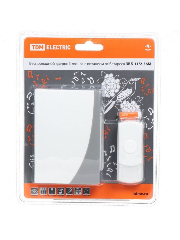 Звонок дверной беспроводной, на батарейках, 36 мелодий, кнопка IP 44, 3 х 1.5 В, АА, TDM Electric, ЗББ-11/2-36М, SQ1901-0002