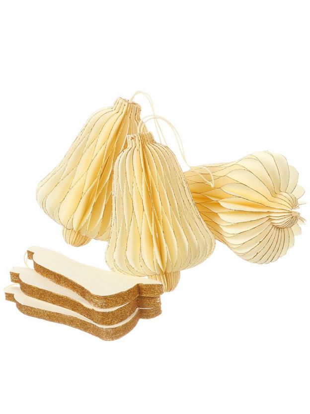 В наборе 6 средних колокольчиков из бумаги с блестящим покрытием, каждый на удобной подвеске.