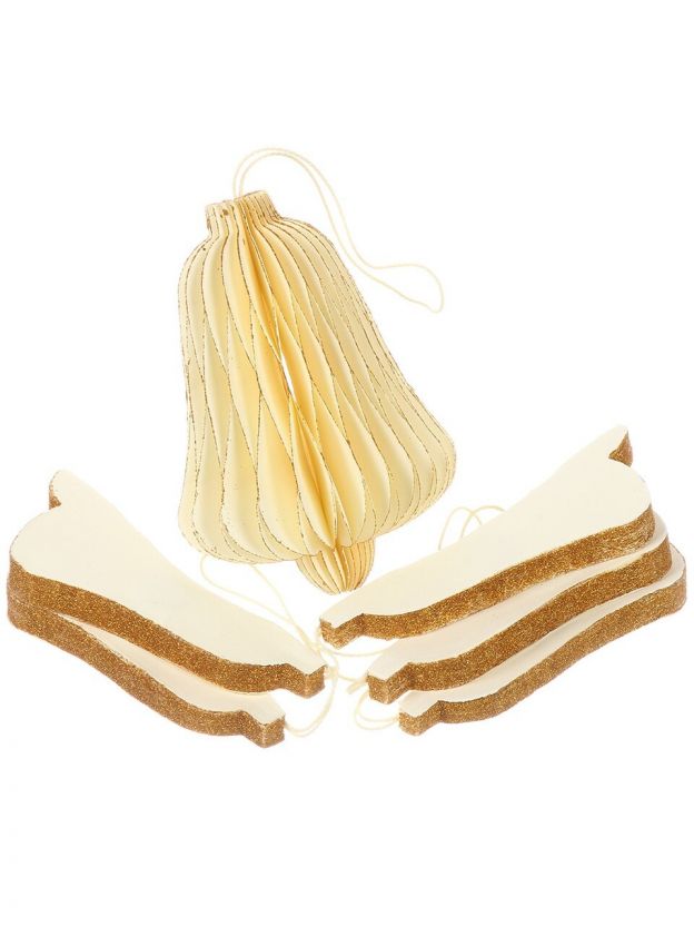 Елочное украшение из бумаги "Колокольчик" (бежевый с блеском, набор 6 шт.) — стильный и безопасный декор для новогодней елки, дома и подарков. Легко повесить, не бьется, выгодно для семей с детьми.