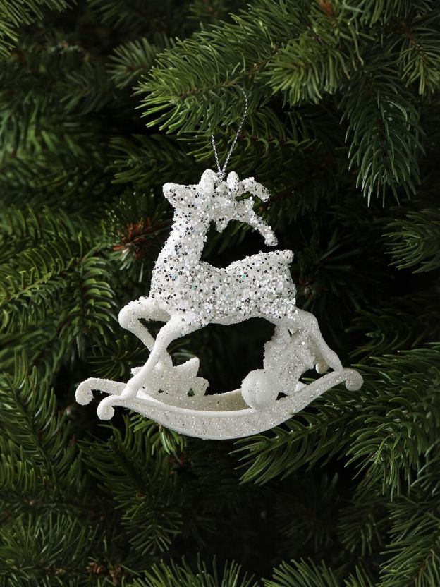 Элегантное елочное украшение "Олень" (белый с серебром, 11 см): стильная защита от разбитых игрушек для дома, улицы и подарков — прочный пластик, блеск и универсальность.