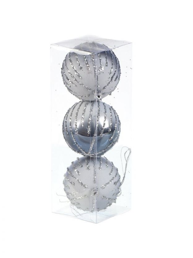 В наборе 3 шара, каждый диаметром 8 см. Цвет — бело-голубой, дизайн однотонный, крепление — на подвеске.