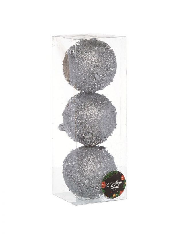В наборе 3 елочных шара диаметром 8 см каждый, серебристого цвета, с подвеской для легкого крепления.