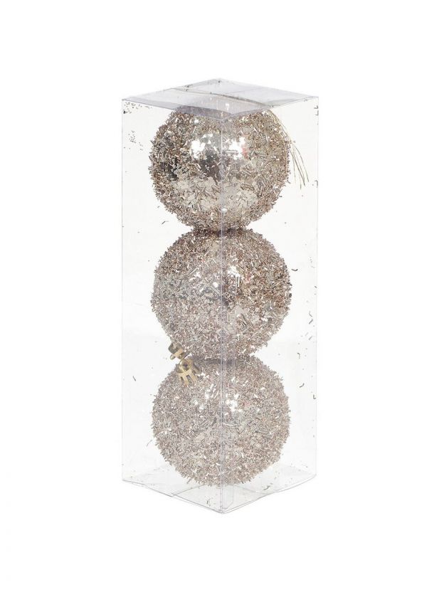 Диаметр каждого шара — 8 см, цвет — шампань (бежевый), покрытие с блестками, тип крепления — на подвеске, материал — пластик.