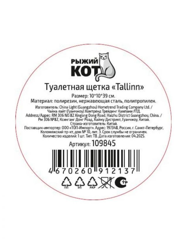 Эргономичный ерш для туалета Рыжий кот Tallin 10х10х39 см: стильный дизайн, долговечный материал, идеальное решение для чистоты дома и дачи.