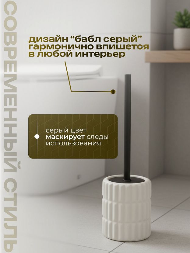 Напольный ерш для туалета «бабл серый» — это не просто аксессуар, а элемент уюта и гигиены. Керамический корпус устойчив к образованию налёта, а серый цвет маскирует следы использования, что особенно важно для поддержания чистоты. Если вы ищете, какой ерш для туалета выбрать для дома или дачи, обратите внимание на эту модель: она не впитывает запахи, легко моется и сохраняет презентабельный вид даже при частом использовании.