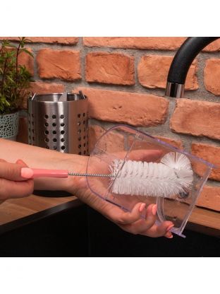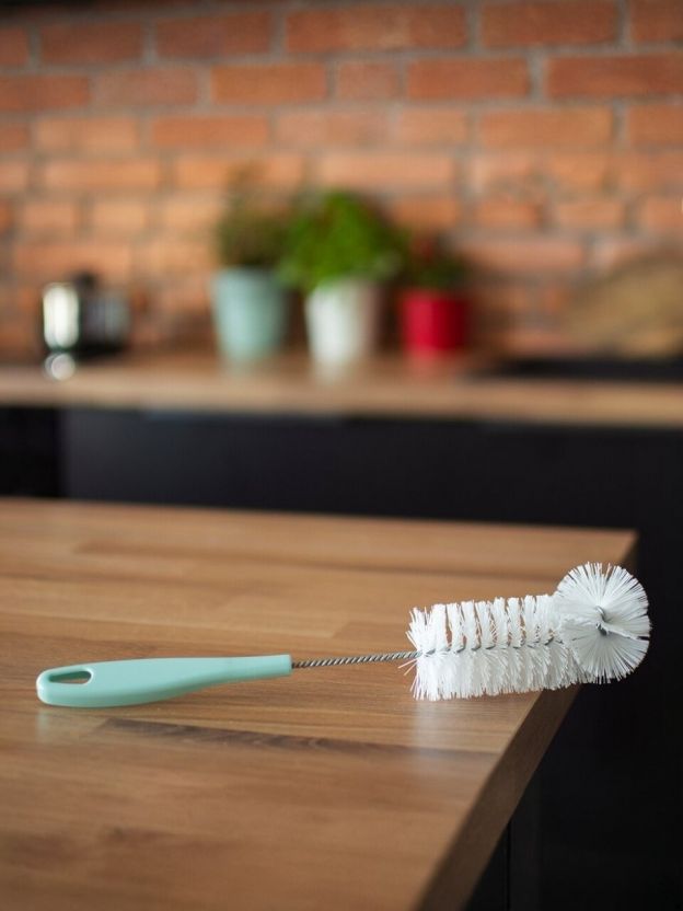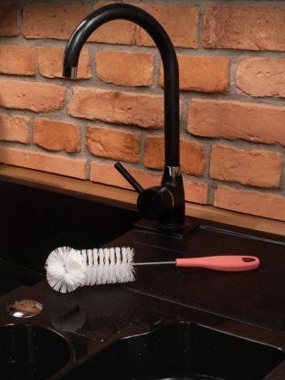 - благодаря щетине средней жесткости легко удаляет загрязнения даже с труднодоступных частей посуды и бутылок