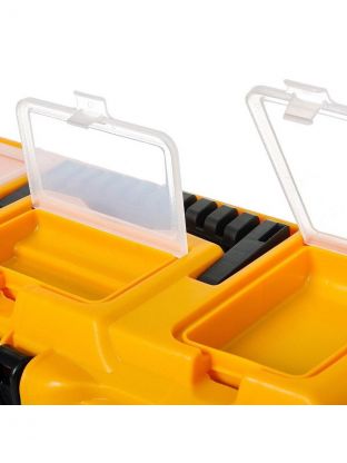 Крышка ящика оснащена тремя прозрачными отделениями, которые закрываются на защелку. Для более комфортного переноса в руках, на крышке предусмотрена удобная ручка.