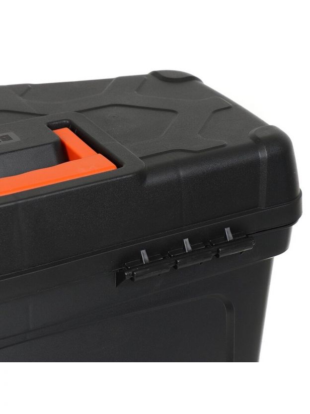 При этом бокс надежно закрывается при помощи накладных пластиковых фиксаторов, а в его съемную крышку можно положить инструменты, которые необходимы для использования прямо сейчас. Ящик дополнен удобной ручкой и легко перемещается.