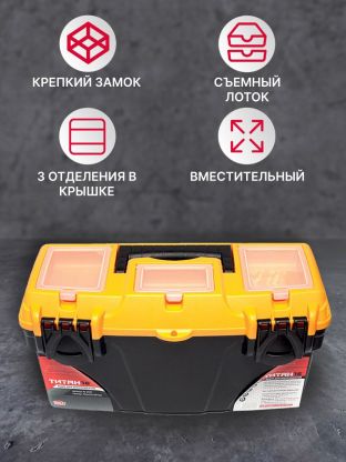 Титан М 2935 — простой и надежный ящик, используемый для хранения и транспортировки инструментов, метизов и различных хозяйственных мелочей. Имеет три отдельные прозрачные секции в крышке.