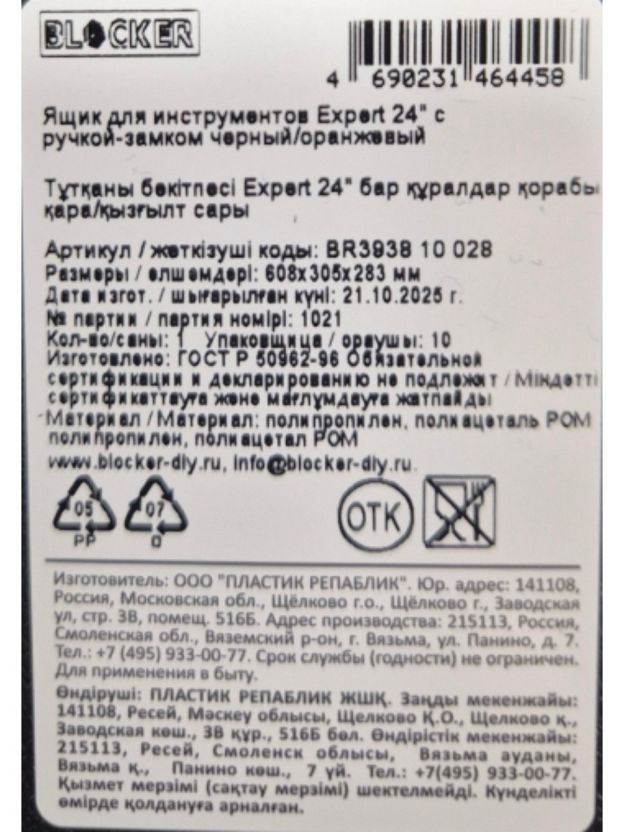 Ящик для инструментов, 24 '', пластик, Blocker, Expert, без замка, ручка-замок, черный, оранжевый, BR393810028
