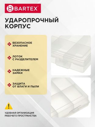 Ящик Bartex — это незаменимый помощник для любого мастера. Он выполнен из прочного материала, который обеспечивает надёжную защиту содержимого от повреждений и влаги. Внутри ящика есть несколько отделений для удобного размещения всего необходимого.