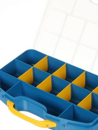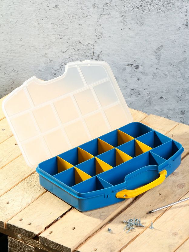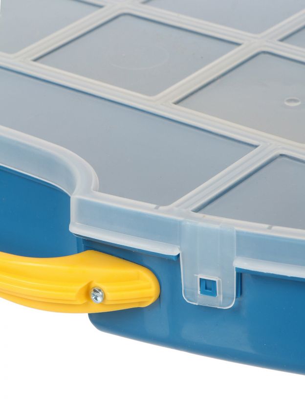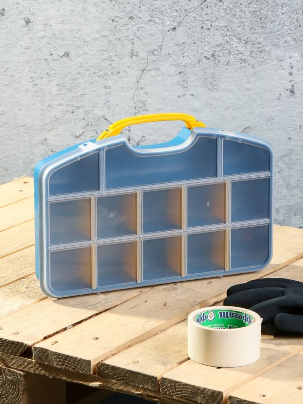 Длина органайзера — 36 см, что позволяет разместить большинство популярных инструментов и аксессуаров. Материал — прочный пластик, цвет — синий, количество отсеков — 13.