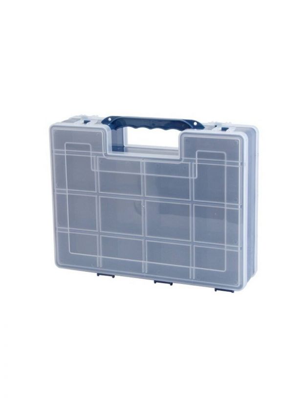 Удобный и вместительный органайзер с ячейками разного размера будет незаменимым для хранения принадлежностей для рукоделия. Прозрачная крышка дает возможность быстро найти содержимое. Канавки на внутренней стороне крышки гарантируют, что при транспортировке содержимое не будет пересыпаться из одной ячейки в другую. Органайзер имеет удобные прочные ручки с надежными защелками.