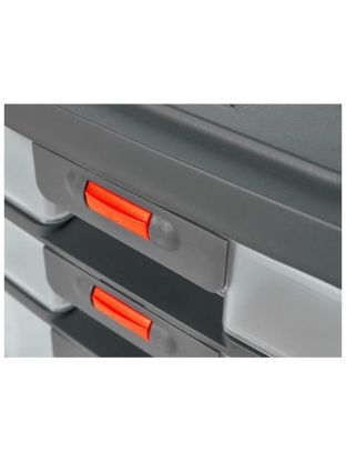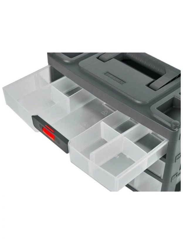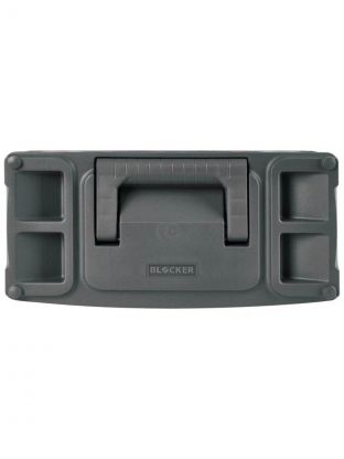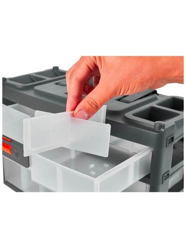 Крышка ящика оснащена съёмными органайзерами для хранения мелочей (внутреннее пространство изменяется под потребности за счёт подвижной перегородки) и отсеком для хранения бит.
